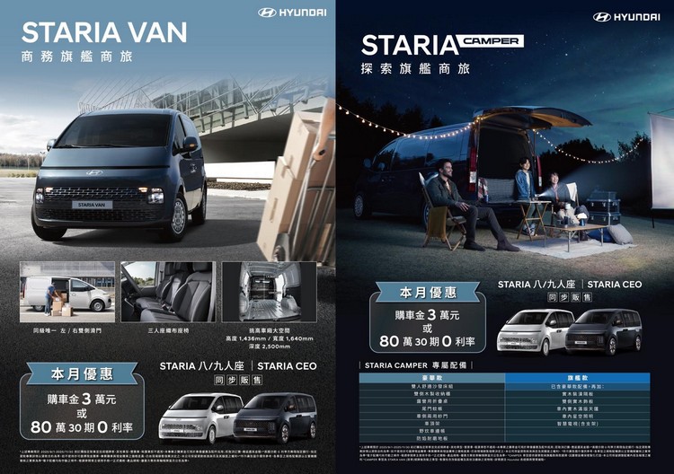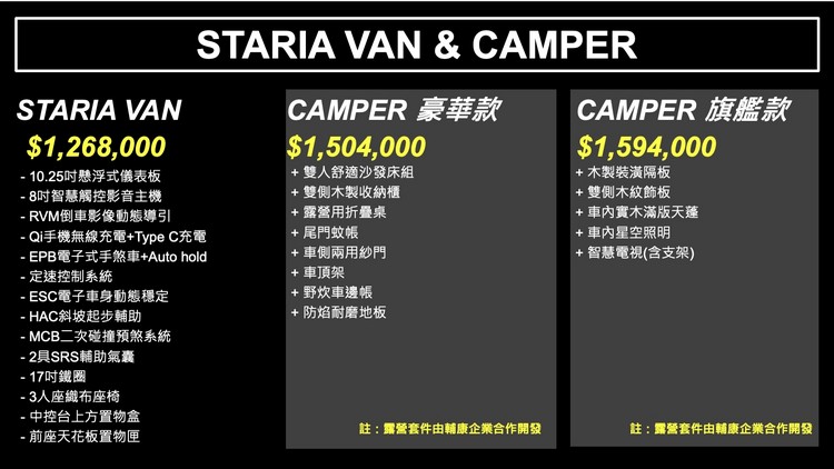 HYUNDAI汽車總代理南陽實業宣布STARIA車系再添新成員,自上市以來,STARIA憑藉獨特設計與多元機能深受市場青睞,本次導入STARIA VAN三人座貨車與STARIA CAMPER露營車,正式售價分別為STARIA VAN:126.8萬 STARIA CAMPER 豪華款:150.4萬/旗艦款:159.4萬。
