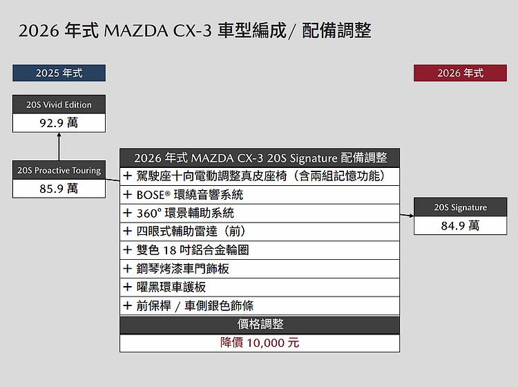 台灣馬自達推出26年式Mazda CX-3 20S Signature車型,正式售價84.9 萬元,如搭配汰舊換新最高 10 萬元貨物稅減徵新制,最低74.9萬元就能入手,標配包含電動駕駛座椅、Bose音響及360環景系統等配備。