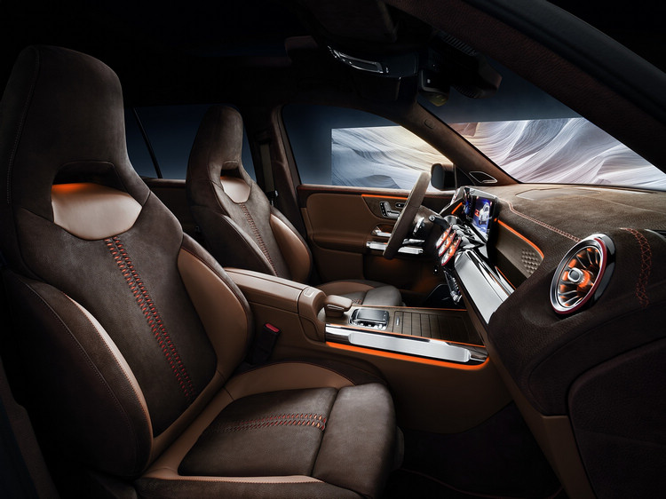 ![]() 座艙與座椅配置是GLB另一項重點,展示車採用的是皮革與鋁質飾板組合而成的座艙,基本配置與 B-Class相同,也具備超寬螢幕及MBUX的配備,不過配合其外觀特質,加入管狀鋁質元件和大膽的縫線包裝出完全不同的越野風貌;儀表板和中控台上的木質飾板採用開孔胡桃木製成,蜂巢狀圖案則是概念車內裝重要元素,都是為了加強這款車的越野及樂趣印象。