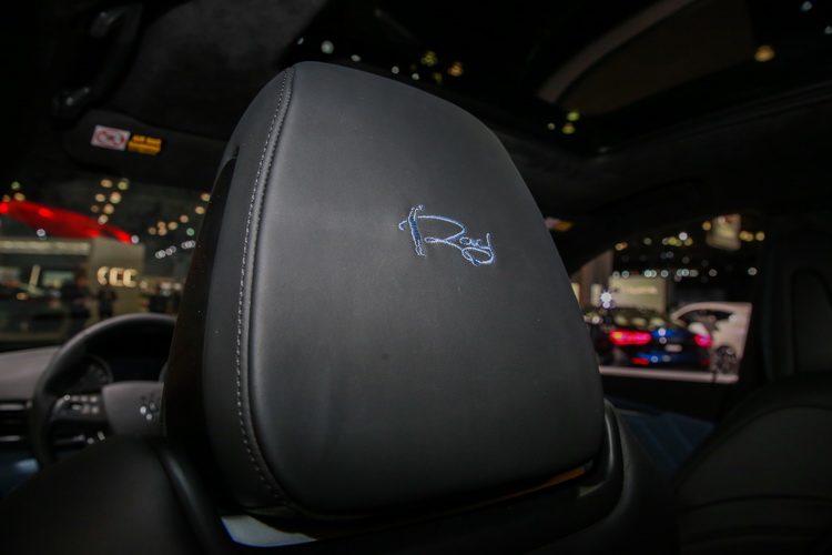 車室內在中控台、儀表板與車門內側飾板都是以碳纖維為主再混搭藍色織布材質,3D的表面編織工法看起來也更具有立體感。有趣的是,車室地毯則是混合了兩種與籃球運動有關的材質─類似籃球網的繩線與類似運動鞋底的樹脂材質,透過特殊的技術將兩種材料混搭,所做出的地毯既新鮮特別有別具都會感。此外,駕駛座頭枕後方嵌有Ray Allen的簽名字樣,車門飾板則以雷射雕刻著「for Ray」的字樣。