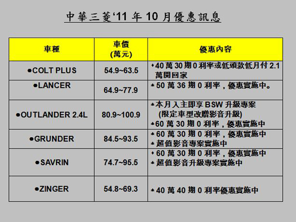 在車型優惠部分,10月份MITSUBISHI MOTORS仍舊維持40~60萬不等的30期零利率專案,讓買車輕鬆無負擔。