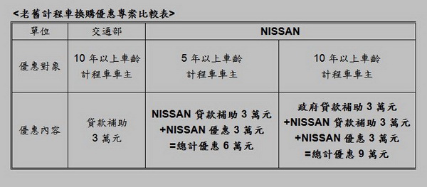 為響應交通部所推動之「計程車維新方案」,裕隆日產汽車宣布擴大優惠,加碼支持老舊計程車換購專案,自2012年1月2日起至2012年6月30日止,凡符合優惠資格之計程車車主,購買NISSAN全車系任一車款,裕隆日產除了提供既有政策中新台幣3萬元貸款補助優惠外,再加碼優惠3萬元,總計優惠6萬元整;車齡10年以上之計程車車主,還可額外向交通部申請貸款補助3萬元,最多可得到9萬元的加碼優惠。