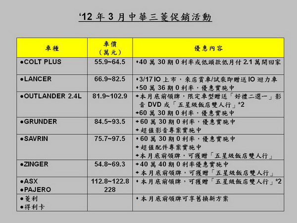 MITSUBISHI優惠送不完,3月推出「三菱RV 五星級玩咖」、「金喜優惠龍呼你 中華三菱商用車舊換新」兩大購車方案,以雙促銷優惠一舉犒賞喜愛RV的準車主與出外打拼的頭家朋友。