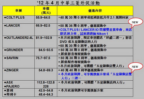 ![]() 外,為回饋RV車車主,4月將延長「三菱RV 五星級玩咖」活動,MITSUBISHI特別精選了礁溪老爺大酒店、花蓮遠雄悅來大飯店、高雄義大皇冠假日飯店、璞石麗緻溫泉會館與墾丁凱撒大飯店等10家五星級飯店,凡於月底前到全省經銷商購買SAVRIN、ZINGER、OUTLANDER、ASX、PAJERO任一款RV車,立即招待你入住五星級大飯店!而換購ZINGER的車主好康多更多,買新車還可有享舊換新方案或入住五星級大飯店二擇一的超值優惠。