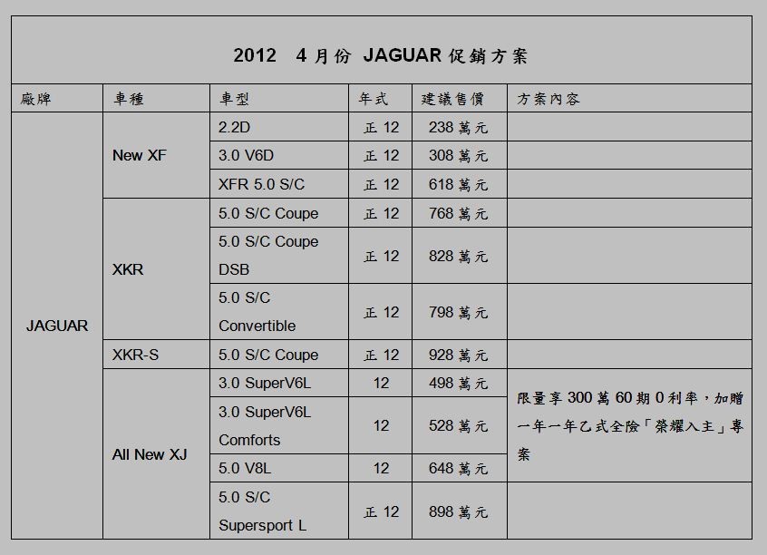 JAGUAR台灣總代理九和汽車四月份宣佈,現在入主搭載新世代缸內直噴科技的AJ-V8自然進氣V8汽油引擎,最大動力可達385hp/52.6kgm的All New XJ 5.0 V8L和配置以高扭力輸出著稱的第三代3.0升AJ-V6D序列雙模式雙渦輪增壓柴油引擎,最大輸出可達275hp/61.2kgm的All New XJ 3.0 SuperV6L及3.0 SuperV6L Comfort,總代理提供300萬60期0利率並加贈一年乙式全險的「榮耀入主」專案。