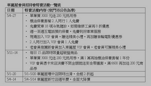 另外,5/1~5/20車麗屋環中店限時出清,全館2折起;5/4~5/14車麗屋新竹店週年慶,全面大降價,皆有不同的限定優惠。全台門市還有眾多會員致敬禮,讓您福利漲停板,荷包省滿滿,趕快來車麗屋汽車百貨A好康吧!獨家限定好康,錯過再等一年,活動詳情,請速洽車麗屋全台15家門市。