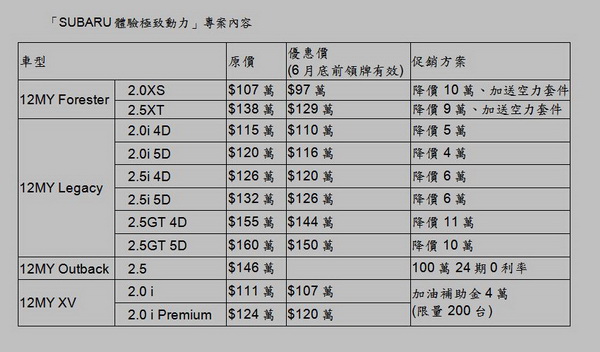 ![]() SUBARU台灣意美汽車特別針對旗下LEGACY、FORESTER、XV等車系12年式車款推出限量購車優惠:即日起12MY FORESTER 2.0XS 與FORESTER 2.5XT不僅能免費搭配空力套件,更分別可享10萬及9萬的限量優惠;12MY LEGACY全車系則皆享有優惠,其中LEGACY 2.5GT 四門車型及五門車型分別只要144萬及150萬即可入主,最高優惠達11萬元;此外,甫於四月下旬上市的全新都會潮旅XV亦同步提供4萬元的油資補貼優惠。