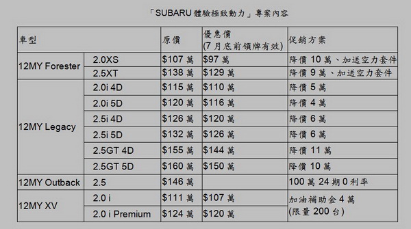 SUBARU台灣意美汽車持續針對12MY全車系動力車款推出限量購車促銷方案,其中12MY FORESTER 2.5XT不僅加送空力套件,更可享降價9萬的限量優惠;而12MY LEGACY 2.5GT 四門車型及五門車型也分別只要144萬及150萬即可入主,最高優惠達11萬元。