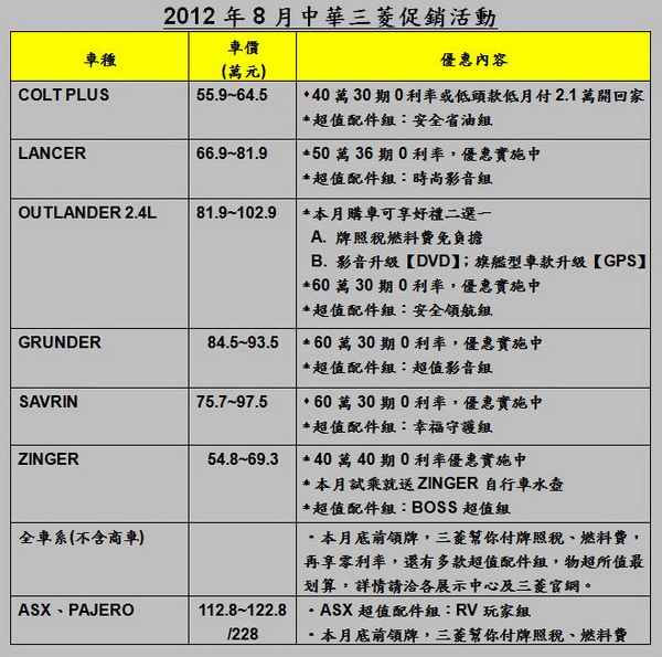 根據調查顯示,近八成四的上班族每個月存不到一萬元,中華三菱決定八月份延長「省錢王牌」優惠活動。買車不僅享有40萬~60萬分期零利率優惠,優惠期間還能享有「三菱幫消費者付牌照稅、燃料費」等好康回饋。