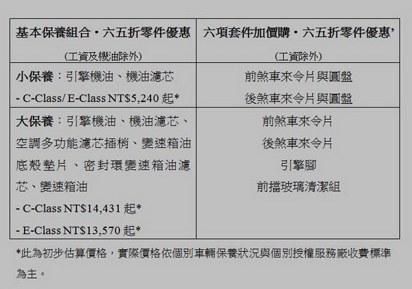 台灣賓士為提供給車主最尊貴的禮遇,於8月17日~10月18日止,特別針對旗下C-Class (W203車型,2000~2007年式)及E-Class (W211車型,2002~2009年式)推出超值保養與零件優惠方案,只要選擇至台灣賓士授權服務廠進行小保養或大保養,即可獲享六項優惠套件加價購!此外,活動期間至台灣賓士網站活動頁面預約回廠,即可列印汽車電子相關零件六折優惠券乙張,凡於本次活動期間消費小保養或大保養者,可於當次或一年內使用本優惠券。
