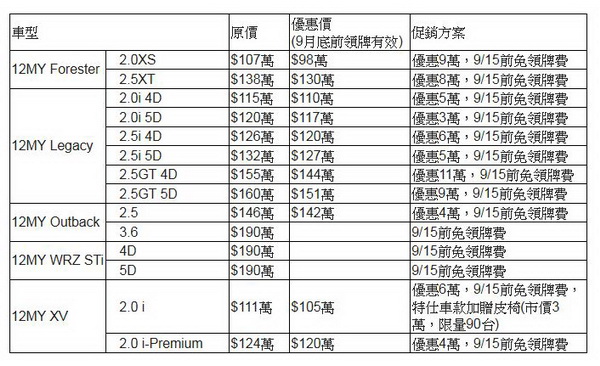 SUBARU台灣意美汽車於今年8月引進限量配額的全新後驅小跑車SUBARU BRZ,已於9月1日起恢復以152萬的正式售價接單。並於9月份繼續推出「SUBARU 沒有理由不愛」優惠專案,針對旗下12 MY熱門車系車款—FORESTER、LEGACY、OUTBACK、XV—提供3萬至11萬不等的價格優惠,同時也將全車系車款免領牌費的特惠延長至9月15日。