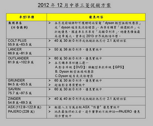 ![]() 2012台中資訊月MITSUBISHI MOTORS延續「Drive@earth」的品牌精神,除了展出旗下熱銷車種外,還將展示全系列綠能二輪商品,與資訊迷一同響應色環保。此外,展覽期間為了回饋消費者,特別推出「三菱好吸力dyson好禮二選一」促銷方案,凡購買全車系商品(商用車除外),買就送「dyson 輕型無線吸塵器」或「dyson 暖房氣流倍增器」等好康大禮,如再搭配購買七折起優惠之「精選配件」及國產車「高額0利率」購車方案,最高可享有8萬元之優惠折扣。