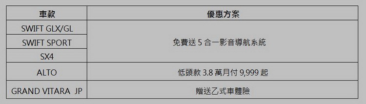 SUZUKI於7月份多種車款持續推出好康專案,熱門車款SWIFT GLX/GL,SX4,及SWIFT SPORT 免費送5合一影音導航系統。輕巧可愛的ALTO則有低頭款3.8萬月付9,999起專案。