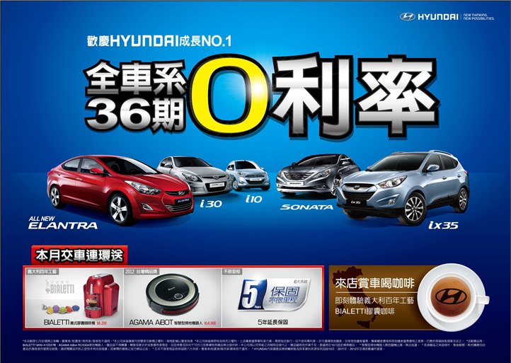 消費者最希望的是能輕鬆負擔購車,HYUNDAI推出了全車系高額0利率,更將購車分期的期數拉高至36期,除讓消費者月付低負擔外,更直接省下三~五萬多元的利息費用,且還能讓消費者能夠以更輕鬆的頭款來購得喜愛的車款。HYUNDAI ix35全車系本月(7月)底交車,享60萬36期0利率。ELANTRA 及i30全車系本月(7月)底交車,享高額度50萬36期0利率;i10車系本月(7月)底交車享高額度40萬36期0利率。