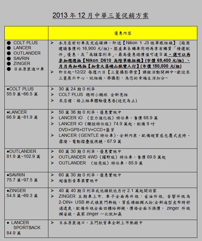 為結合兩年一度的台北新車大展擴大買氣,MITSUBISHI推出最強促銷方案,凡於月底前購買OUTLANDER、OUTLANDER iO、COLT PLUS、LANCER FORTIS、LANCER iO、SAVRIN、ZINGER、LANCER SPORTBACK及PAJERO任一車款,並完成領牌手續,立即贈送 【Nikon 1 J3 微單眼相機】 (廠商建議售價約16,900元/組)。此外,週週抽【Nikon D610 高階單眼相機】(市價69,400元/組) 、月月加碼再抽【加拿大落磯山脈雙人行】(市價150,000元/組),越早買車機會越大。