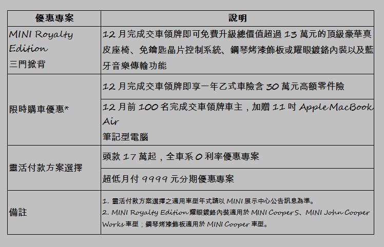 而為了讓更多MINI Fans可以輕鬆實現擁有MINI的夢想,凡於年底前入主,即可享一年乙式全險含30萬高額零件險;前100名入主MINI車主更可獲得11吋Apple MacBook Air筆記型電腦;超低月付9,999元分期優惠專案也同步實施中。