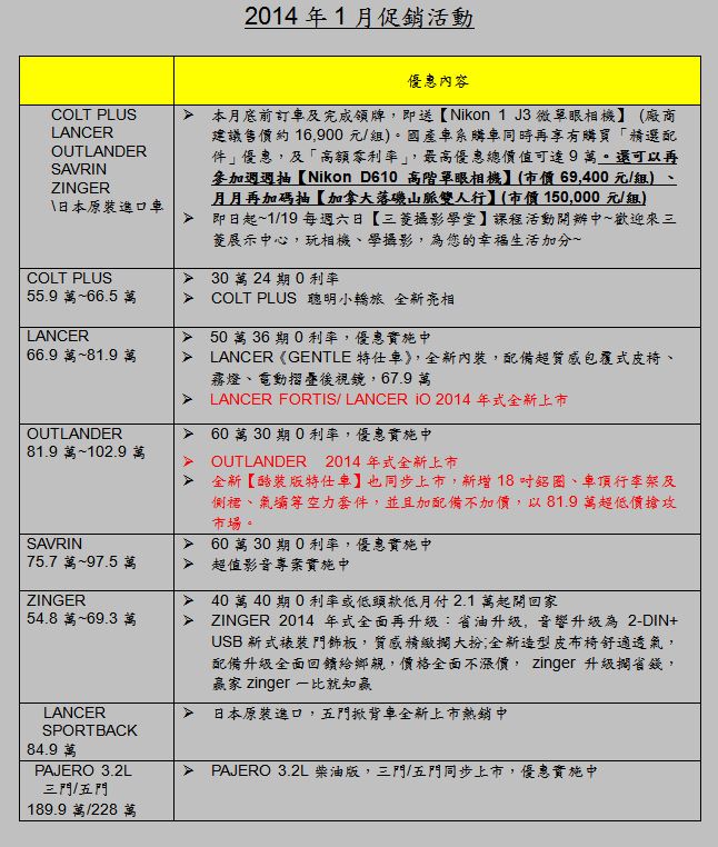 MITSUBISHI一月促銷方案出爐,凡於月底前購買OUTLANDER、OUTLANDER iO、COLT PLUS、LANCER FORTIS、LANCER iO、SAVRIN、ZINGER、LANCER SPORTBACK及PAJERO任一車款,並完成領牌手續,立即贈送 【Nikon 1 J3 微單眼相機】 (廠商建議售價約16,900元/組)。 此外,週週抽【Nikon D610 高階單眼相機】(市價69,400元/組) 、月月加碼再抽【加拿大落磯山脈雙人行】(市價150,000元/組),越早買車機會越大。還有好評不斷的「三菱攝影學堂」活動同步放送中,即日起至1月19日至全省中華三菱展示中心報名,就能參加Nikon School攝影課程。