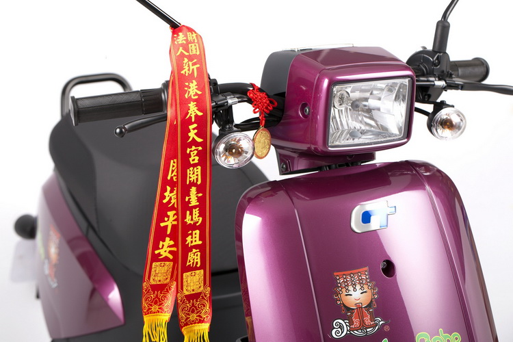 全新「e-moving Bobe新港媽祖加持版」車身設計有新港媽祖式樣的富貴金色車身貼紙,車把手還繫上奉天宮為本次合作特別提供的紅彩及平安符,車尾則有新港媽祖車型牌,車色共有吉祥紅與富貴藍2種選擇,只要29,800(含稅,已扣除環保署3000元補助),全台限量100台售完為止。歡迎親洽全國e-moving經銷商賞車或上e-moving官網 http://www.e-moving.com.tw