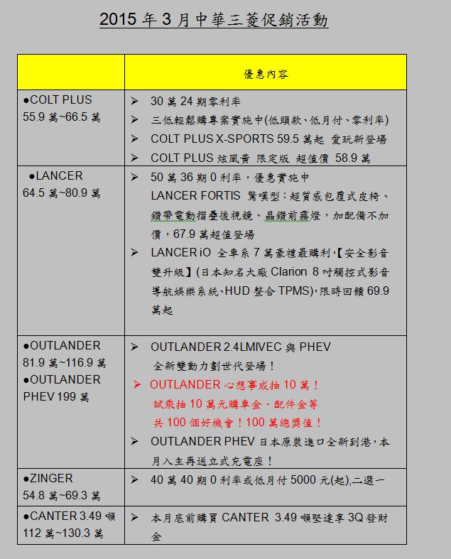 2015開春買氣熱烈延續,為回饋消費者購車支持,中華三菱優惠活動持續加碼至三月份。為了慶祝OUTLANDER上市以來創下亮眼銷售成績,除了提供全車系購車低頭款或零利率優惠外,本月特別新推出OUTLANDER試乘及購車獎勵金活動。