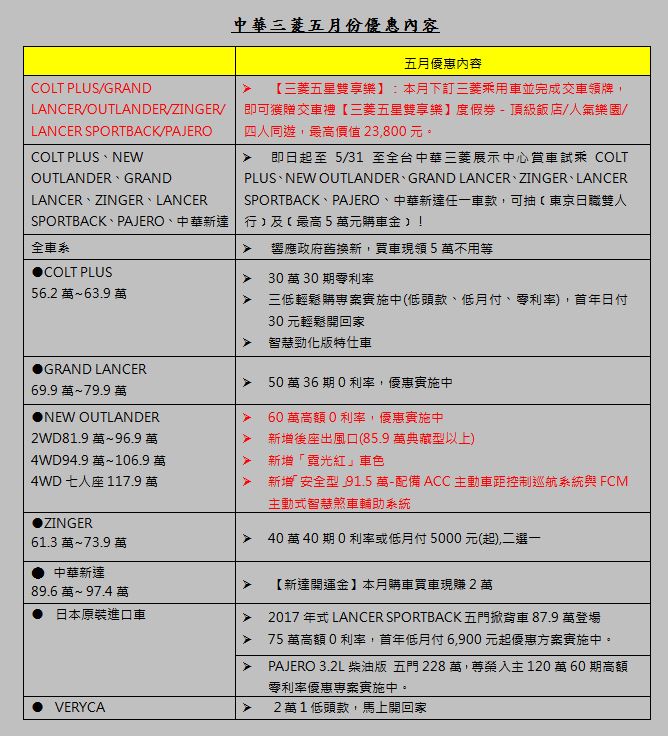 中華三菱五月份訂車且完成領牌COLT PLUS、GRAND LANCER、OUTLANDER、ZINGER、LANCER SPORTBACK、PAJERO任一車款,即可獲贈『三菱五星雙享樂』度假券乙張,內含精選頂級度假飯店一晚及主題樂園門票,四人同遊套裝行程最高價值23,800元,邀您開新車帶著全家來趟輕旅行!