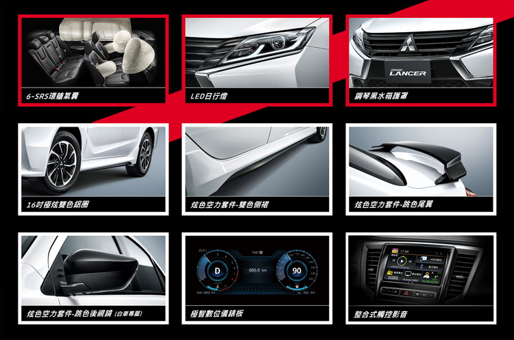 「勁黑,讓白車更出色;燄紅,讓黑車更獨特」。GRAND LANCER全新升級的炫色空力套件,包含:跳色尾翼、雙色側裙、跳色後視鏡(白車專屬),搭配鋼琴黑的水箱護罩,以及16吋的極炫雙色鋁圈,車前LED日行燈的L型導光條設計,更顯外觀獨特。此外,內裝搭載「極智數位儀錶板」、「整合式觸控影音系統」,全方位整合車輛資訊,讓行車狀況一覽無遺,更可依照心情調整「極智數位儀錶板」風格模式,增添駕駛樂趣。