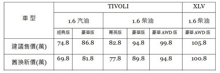 sangYong TIVOLI自2018年小改款上市便標榜「百萬內最安全的休旅車」,2019年式TIVOLI延續此定位,貼心升級安全配備再降價7萬,入門款1.6汽油經典版舊換新價僅需69.8萬:全車系標配7氣囊,新增HDC陡坡緩降系統、熄火離車自動上鎖系統,為百萬內進口唯一搭載7氣囊、AEB自動煞停、LKA車道維持、HDC陡坡緩降等18項主安系統的跨界休旅車款,