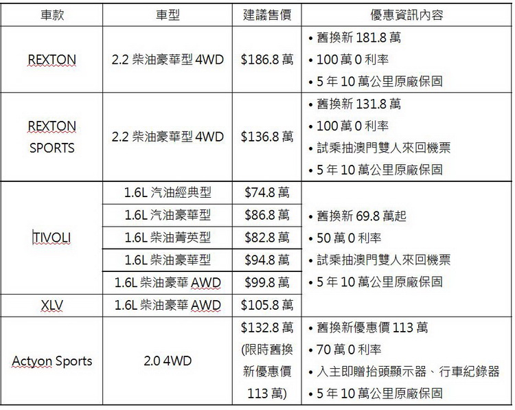 SsangYong總代理永嘉雙龍汽車為回饋喜愛SsangYong的消費者的支持,於2019年9月1日起至2019年9月30日止,特別推出「奔FUN夏日」三大購車優惠活動,活動期間來店試乘進口跨界休旅《TIVOLI》、《XLV》與豪華越野運動皮卡《REXTON SPORTS》,就有機會獲得「澳門雙人來回機票」,全車系享舊換新最高19.8萬優惠與高額零利率回饋,再享全車系「5年10萬公里保固」。