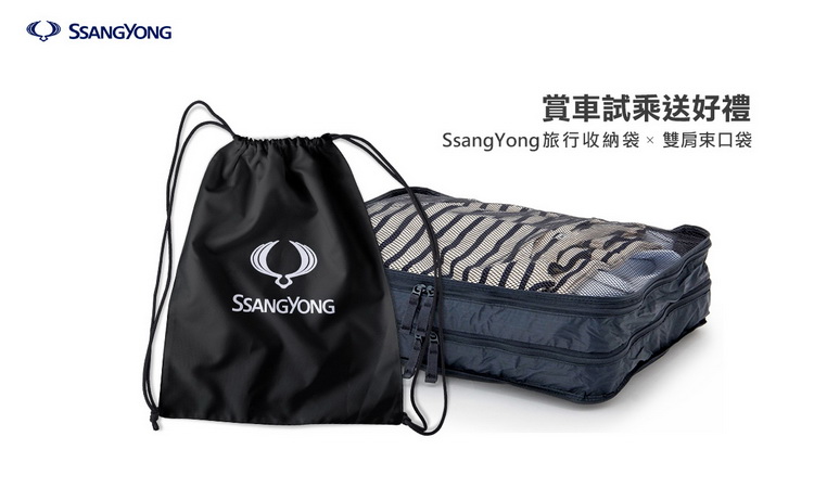 ![]() 即日起至9月底凡來店鑑賞SsangYong全車系車款,即可獲得品牌精品「SsangYong雙肩束口袋」,試乘再送「SsangYong精品旅行收納袋」(數量有限,贈完為止)。