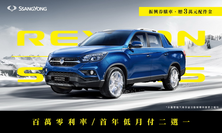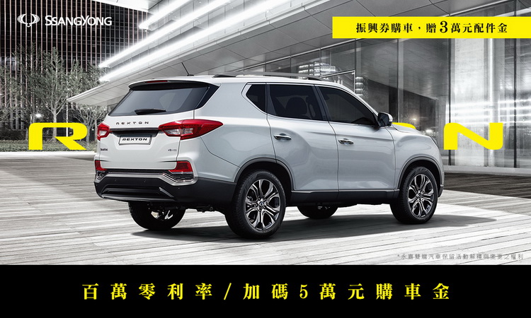 為響應政府振興三倍券政策,SsangYong總代理永嘉雙龍汽車推出「振興入主十倍奉還」活動,活動期間內(7/1-7/31)持振興券3000元入主SsangYong雙龍汽車任一車款,即贈3萬元專屬配件金;再享「不限里程、不限次數免費拖吊服務」,還有5年10萬公里原廠保固。活動期間來店賞車試乘即贈品牌好禮SsangYong行李收納袋,入主指定車款還可額外獲得5萬元購車金。