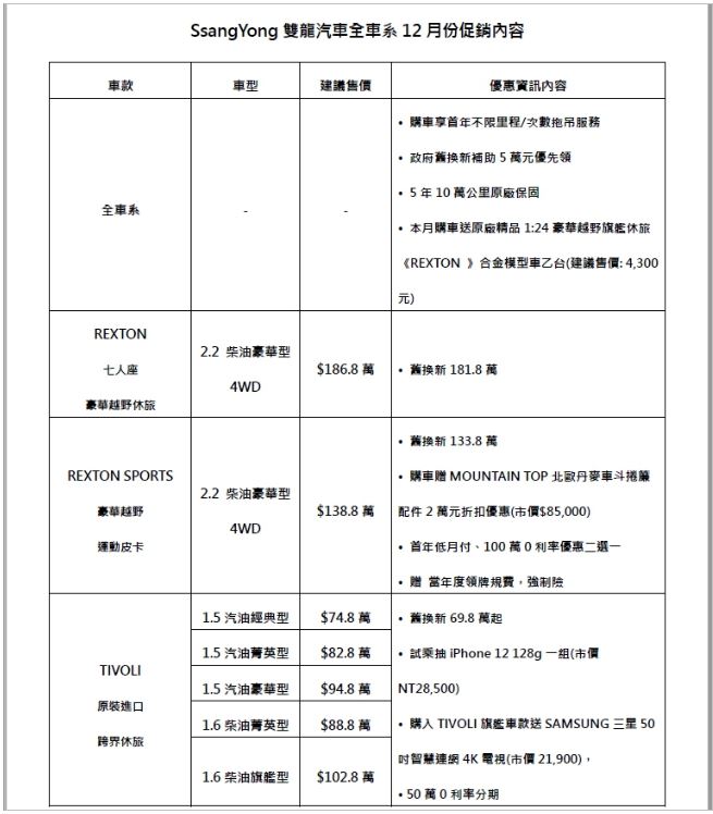 SsangYong總代理永嘉雙龍汽車在12月份針對TIVOLI進口跨界休旅推出年底加碼購車優惠,凡於活動期間來店試乘TIVOLI就有機會獲得iPhone 12 128g一組(市價NT28,500),購入TIVOLI旗艦車款再送SAMSUNG三星50吋智慧連網4K電視(市價NT21,900),活動期間內購車皆可享50萬0利率優惠、不限哩程次數拖吊服務,讓消費者輕鬆在年底前以最低69.8萬起的魅力價格汰換舊車,入主韓國銷售第一原裝進口跨界休旅SsangYong TIVOLI。