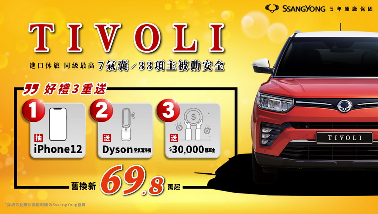 SsangYong總代理永嘉雙龍汽車在農曆新年期間加碼新年購車特案,凡於活動期間內(2/1-2/28)來店試乘TIVOLI全車系,即有機會將iPhone12帶回家(市價NT28,500),除試乘抽獎活動外,月底前購入TIVOLI旗艦車型,再加碼送3萬元購車金、交車禮Dyson Pure Cool Me空氣清淨機(市價 $14,900)。