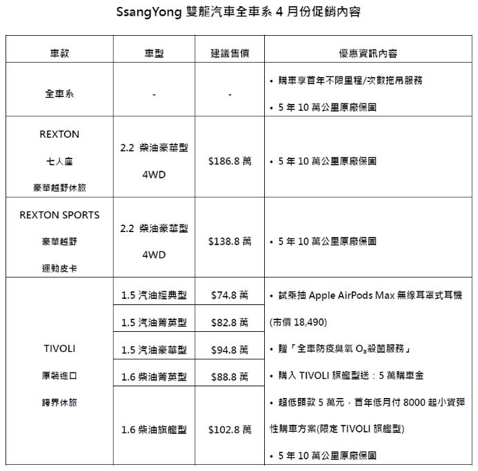 ![]() 活動期間(4/1-4/30)內消費者入主SsangYong全車系皆可享汽車業界最長5年10萬公里原廠保固、不限哩程次數拖吊服務、全車防疫臭氧O₃殺菌服務。