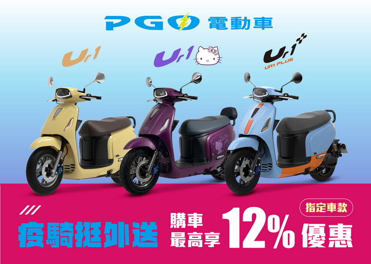 PGO電動車為體恤外送夥伴早晚奔波的辛勞,於110年6月25日至110年09月30日期間,推出PGO疫騎挺外送活動來力挺外送夥伴,凡外送平台外送員購買UR1車系即享指定車款最高12%優惠補助,再享減免三個月$299月租費,希望能夠幫助外送夥伴用最優惠的折扣輕鬆入手PGO智慧電動車,減輕外送夥伴負擔。
