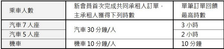 • 活動說明:iRent會員邀請新朋友加入iRent,並完成首筆共同承租人訂單,即可 獲得免費時數。