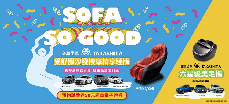 搶攻年底換車潮,買車再送好禮!本月入主GRAND LANCER、OUTLANDER、ZINGER、ECLIPSE CROSS任一車款,且完成領牌即可獲得【TAKASHIMA高島愛舒服沙發按摩椅】(市值42,000元);同樣購買並領牌COLT PLUS、ZINGER PICK UP任一車款,即贈送【TAKASHIMA高島六星級美足機】(市值10,800元)。