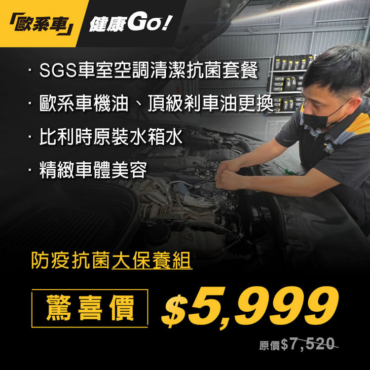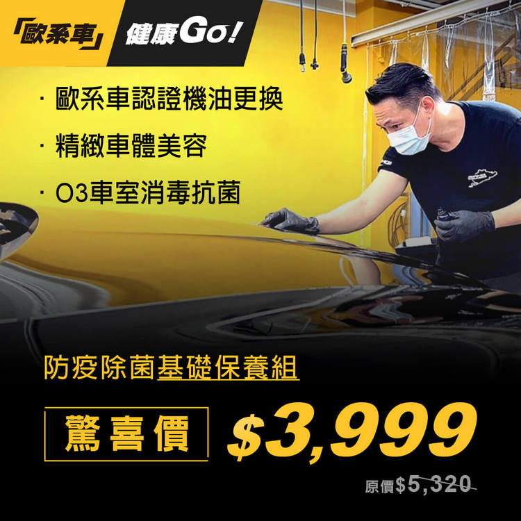 ![]() 即日起~6/30,歐系車專屬的「防疫除菌基礎保養組」套餐,特價$3,999元,汽柴油車皆適用,包含Fuchs 5W30機油6罐與機油芯,同時為車內進行O3消毒抗菌,以及車體美容護理,淨化愛車,為防疫層層把關。另有「防疫抗菌大保養組」套餐,特價$5,999元,除了更換機油、機油芯、煞車油及水箱水等,更增加經過SGS國家檢驗認證的車室淨化抗菌+風箱系統抗菌,細心呵護您的愛車,也為您的愛車做好全方位抗菌防護。