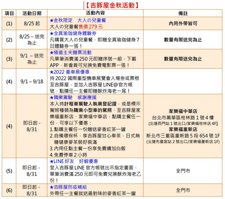 時序進入秋天,台灣吉豚屋除了與2022國際重型機車展覽會合作外,金秋限定餐點大人の兒童餐則與全真瑜珈健身合作,凡點購大人の兒童餐即贈送全真瑜珈健身7日體驗券,讓消費者吃得飽還能健康運動維持好體態!更與由玉木宏主演的電影極道主夫合作,單筆消費滿250元即可獲得一組序號,下載指定APP,新會員可兌換免費電影票一張,等於到吉豚屋享用道地日式美味後,再請您看一場電影!