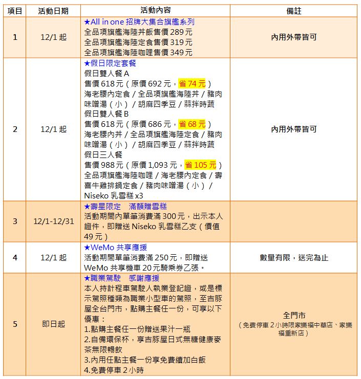 瞄準年末美食商機,吉豚屋回應消費者需求,集合四大招牌推出旗艦系列,此次不僅推出全品項海陸丼飯、全品項海陸定食,還有全品項海陸咖哩,三種選擇任消費者挑選,通通可以吃到4種招牌美味。吉豚屋吃飽飽首推假日限定988三人套餐,網羅全品項海陸咖哩、壽喜燒牛雞排鍋定食以及海老腰內豬排定食與Niseko雪糕!此外,吉豚屋更與WeMo共享機車合作,凡單筆消費滿250元就送WeMo 20元騎乘券乙張,透過共享機車愛護環境,同時還能餵飽五臟廟!