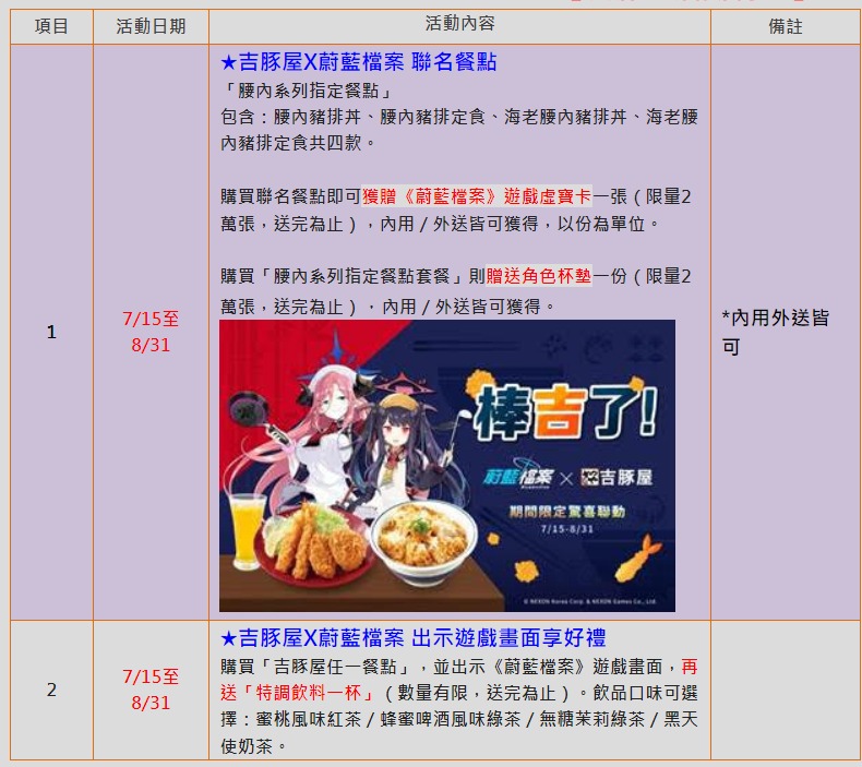 豬排和電玩竟有這層關係?只要在活動期間7月15日至8月31日前往全台吉豚屋門市購買《蔚藍檔案》聯名餐點;四款人氣腰內系列聯名餐點包含:腰內豬排丼、腰內豬排定食、海老腰內豬排丼、海老腰內豬排定食,即可獲得限量虛寶卡一張與角色插卡,購買限定套餐贈送角色杯墊一份。