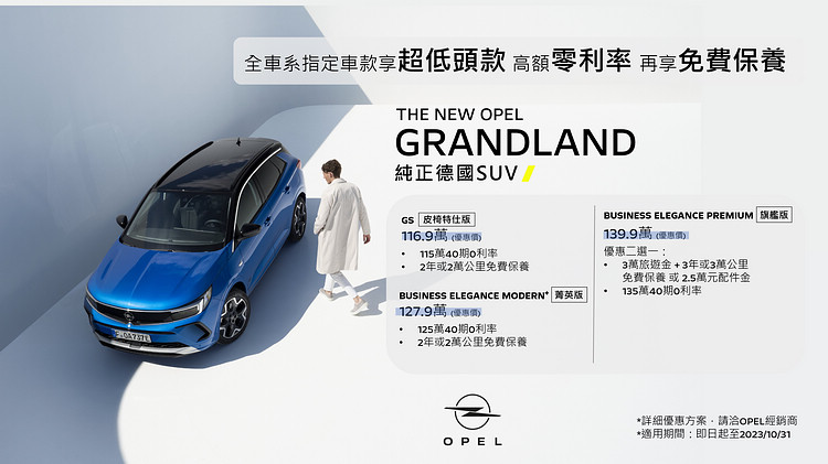 此外,OPEL台灣總代理 歐吉汽車為滿足台灣消費者不同的用車需求與期待,新增OPEL GRANDLAND BUSINESS ELEGANCE PREMIUM旗艦版及OPEL ASTRA GS輕奢版車型,讓消費者在車型配備選擇上更多元。