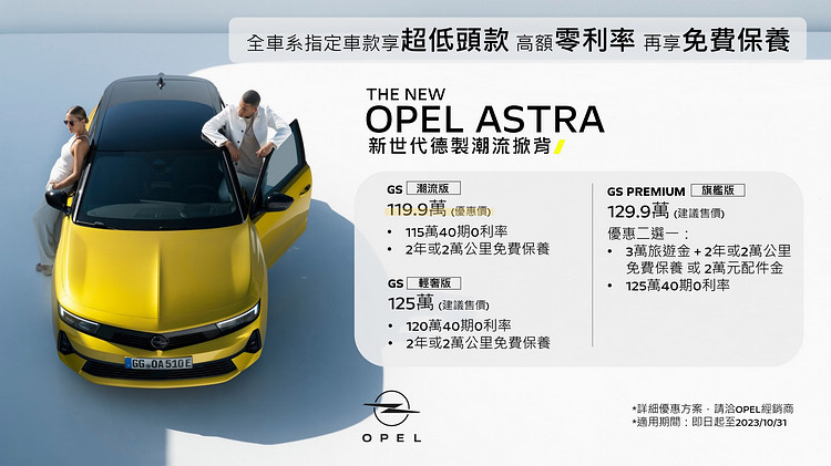 4. ASTRA本月優惠價GS潮流版119.9萬元、GS輕奢版125萬元、GS PREMIUM旗艦版129.9萬元,享超低頭款40期高額0利率,指定車型加贈3萬旅遊金與2年2萬公里保養或2萬元配件金。