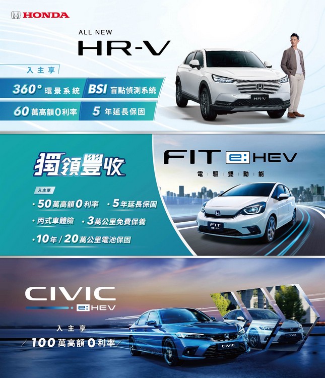 Honda Taiwan歡慶CR-V連續三個月榮登「國產中型SUV銷售No.1」寶座與消費者共享榮耀,本月入主CR-V享「60萬高額0利率」等好禮;入主CIVIC e:HEV享「100萬高額0利率」;入主HR-V享「60萬高額0利率」等4大安心豪禮;入主FIT e:HEV獨領豐收方案送「50萬高額0利率」等5大豪禮。