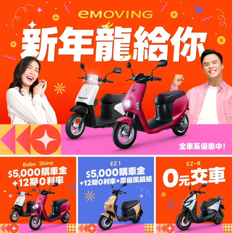 eMOVING各車款同慶新年也推出超值優惠,微型電動車SHINE、Bobe及綠牌輕型EZ1同享購車金5,000元,EZ1再加贈原廠品牌風鏡組;EZ-R則推出「0元交車」方案日付只要98元,簡單入主旗艦白牌電動機車。