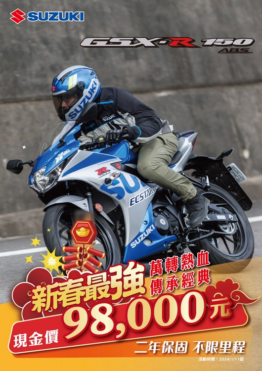 2024年1月11日–隨著新春佳節的到來,SUZUKI台鈴機車再度帶給消費者新年大禮,宣布推出GSX-R150全新優惠方案,將這款最精悍輕量級仿賽輕檔帶入更多騎士的生活。