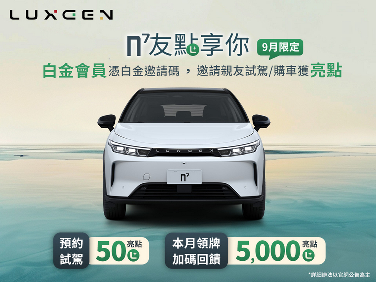 若您是LuxClub<尊榮會員>及<白金會員>,還可以透過LUXGEN與格上租車攜手打造尊榮/白金會員限定的n⁷一日深度試駕活動,全方位的認識n⁷讓您一試成主顧,並且體驗後還能再享1000亮點,等同讓你免費試駕一整天!<尊榮會員>及<白金會員>敬請把握時間於LUXGEN官網線上預約登記,若您還不是<尊榮會員>也不要擔心,只要在9/28 23:59前於線上繳交千元申請成為<尊榮會員>,即可邀請親朋好友與您一起開上n⁷出發探索無限可能!