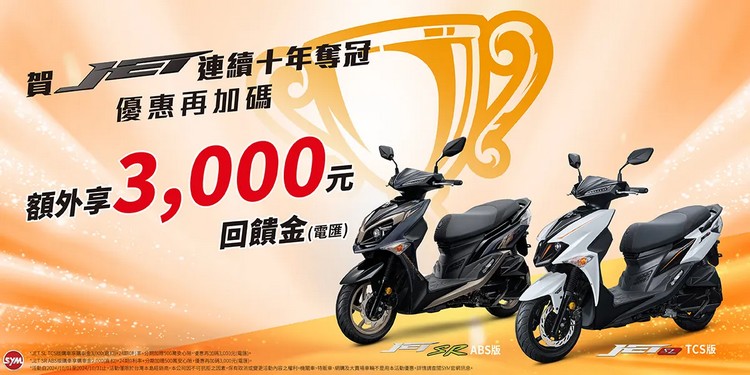 十年來,JET車系已在賽道上陸續奪下了140座冠軍獎盃。為了讓更多的消費者能享受JET的優異騎乘感,SYM針對JET SR ABS與JET SL TCS兩車款除了原有優惠外,額外再加碼3,000元的購車金,提供給除了日常通勤外,還想要更好動力與安全配備的消費者一個實惠的選擇,詳細促銷訊息如下: