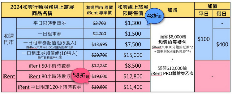 全國超過2,000個取還車據點、服務版圖遍布各縣市的iRent共享汽機車,已是民眾日常移動的好夥伴!今年度線上旅展特別推出「iRent 50小時時數券」及「iRent 80小時時數券」兩項人氣商品,適合精打細算族群,錯過再等一年!使用優惠時數券,換算租金每小時最低160元,若以最受歡迎的COROLLA CROSS假日租車價計算,相當於65折優惠,最高現省6,800元!   此外,iRent為滿足商務人士及日常通勤族的需求,本次推出全新商品「iRent平日限定120小時時數券」,不論短途的工作差旅或城市間的靈活通勤,以此每小時95元的時數券承租iRent,最高可享58折優惠。 和運租車券限時最殺折扣48折起 加碼買10送1