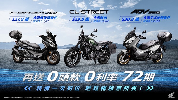冒險意象ADV 350暢旅價:30.8萬,ADV350在城市通勤車的外表下,以粗獷的線條以及色塊增添了冒險元素,加贈電子後箱(價值30,700),提供更多便捷的行李儲存選擇,讓您的冒險之旅更輕鬆、舒適。經典的復古風格CL STREET簡單而純粹,氣宇軒昂的外型、讓騎士盡情揮灑自我風格,暢旅價:29.8萬,加贈馬鞍包(價值9,370),輕鬆攜帶必備物品,隨時準備踏上下一段旅程,以上三台車款,再享72期、零頭款、零利率。