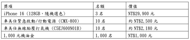 ![]() TOYOTA總代理和泰汽車關心車主的行車安全,特別推出「安全滿貫 抽iPhone」活動,凡於2025年4月1日至2025年6月30日期間,至全台TOYOTA服務廠或保修站購買橫濱輪胎或電瓶,即有機會抽中iPhone 16、行動電源、無線胎壓打氣機及千元機油金等共價值百萬元的多項好禮!