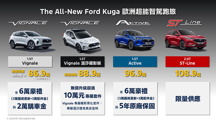 福特六和推出Ford Kuga 1.5T Vignale溫莎曜影版,限量優惠價88.9萬元(含舊換新),無償升級價值超過10萬元的專屬曜影黑化套件以及專屬Windsor溫莎透氣真皮座椅;此外Kuga 1.5T Vignale同步加碼回饋,享舊換新熱銷回饋價86.9萬(含2萬購車金回饋),指定車型再享6萬豪禮及5年原廠保固。